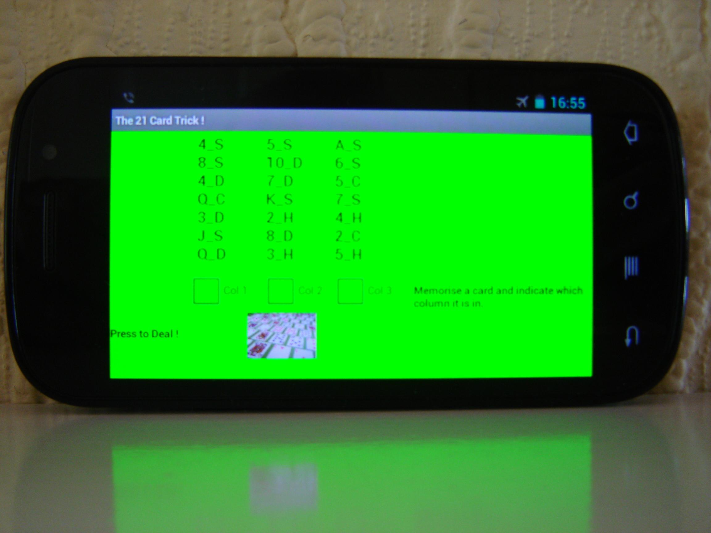 O jogador deve memorizar uma carta de 21 cartões aleatórios exibidos em 3 colunas. O jogo embaralha as cartas e as divide em 3 colunas. O jogador é solicitado a indicar em qual coluna o cartão memorizado está, mas o cartão real não é divulgado. Isso é repetido três vezes e a última vez que o jogo divulga a carta que o jogador memorizou.