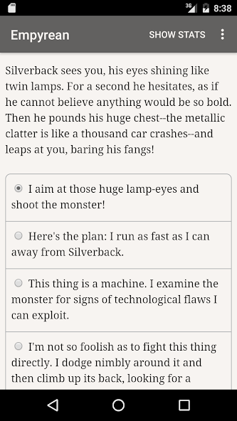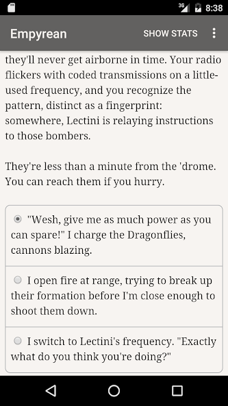 " Empyrean " é um romance interativo de "Flying Ace" de Kyle Marquis, onde suas escolhas controlam a história. É totalmente baseado em texto-325.000 palavras, sem gráficos ou efeitos sonoros-e alimentados pelo vasto poder imparável da sua imaginação.