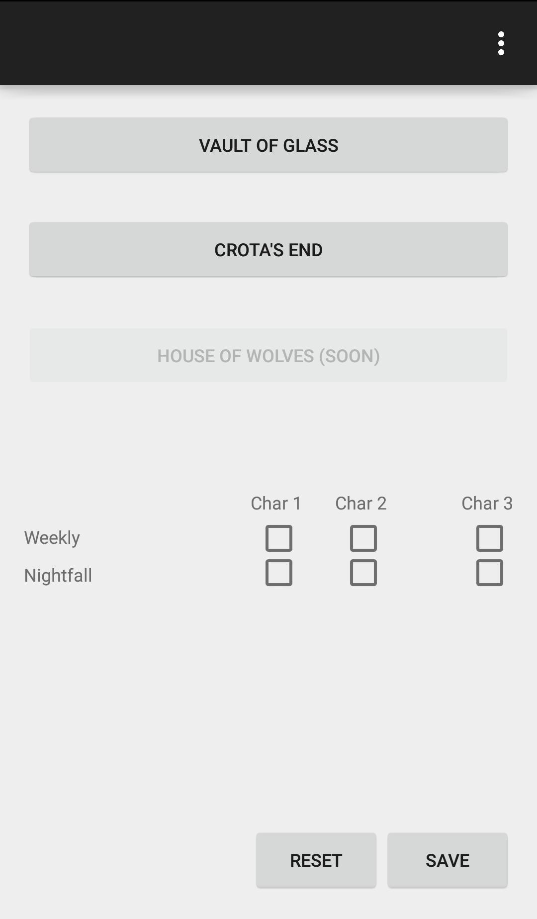 Agora você pode controlar seu progresso e lembrar se você já concluir o ataque, greve semanal e anoitecer.