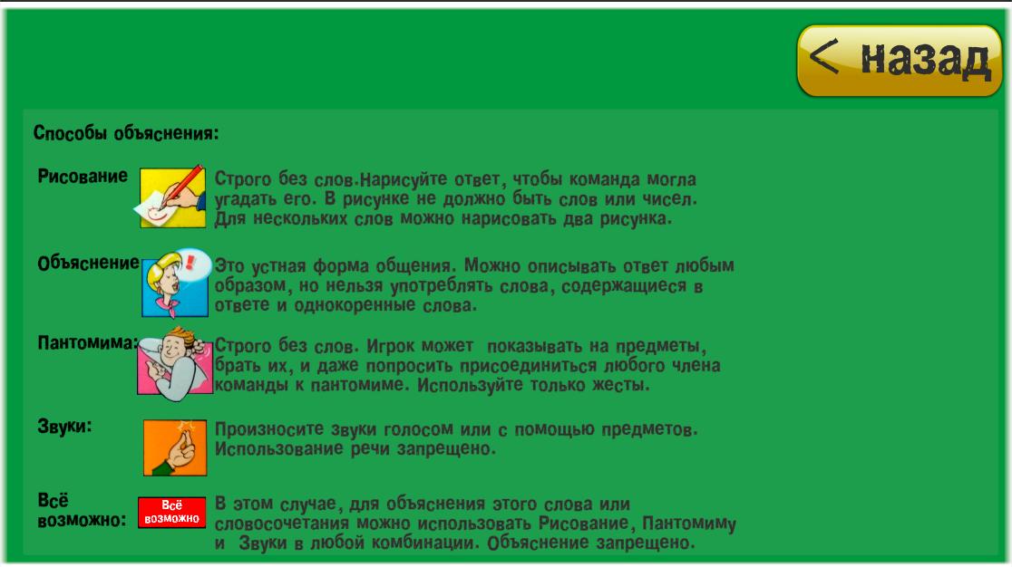 Вы должны объяснить все слова члены их команды точно и правильно, используя различные формы общения (выражения лица, словесные, графические описания и звуки) и быть первым, кто возглавляет