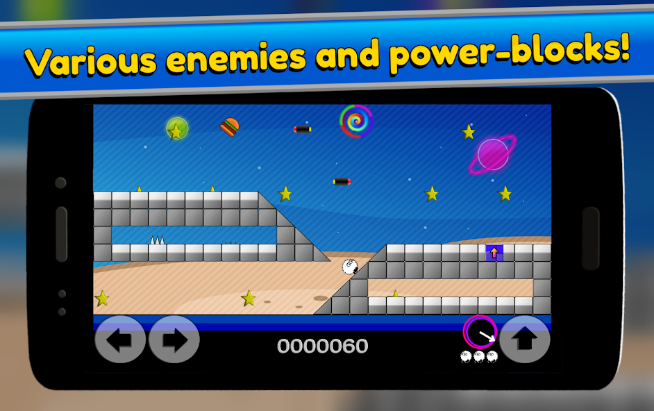 По пути есть много вещей, которые помогут вам (кирпичи с питанием, такие как «Супер-прыжки» и «Транспортные блоки»), а также различных врагов, чтобы препятствовать вашему прогрессу.