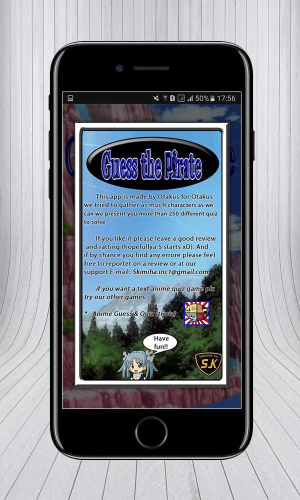 Угадайте пиратское приложение для One Piece - созданное фанатами аниме, для фанатов аниме. Это приложение One Piece имеет различный персонаж из всех дуг манги и аниме более 250 символов, которые бы знали только фанат Areal Otaku.