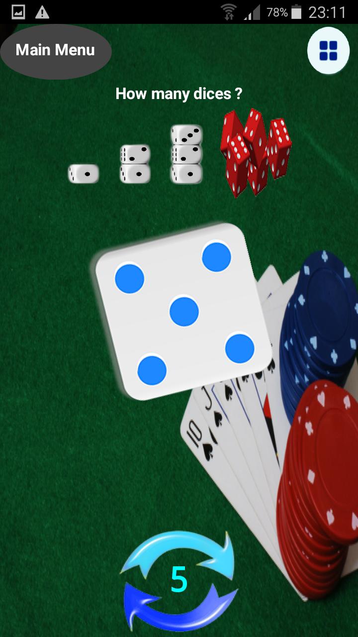 • Вы можете играть в играх в кости и использовать 1 или 2 или 3 кубика "на столе" или гораздо больше кубиков в ведре (от 1 до 1000 кубиков)