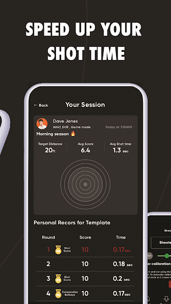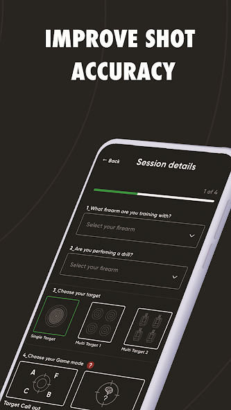 Обучение - это начальная область приложения, где пользователь может практиковать свои навыки стрельбы. После начала сеанса показан экран предупреждения, чтобы гарантировать, что перед началом сеанса происходит правильная безопасность огнестрельного оружия. Как только пользователь согласен, цель появляется на экране. Пользователь калибрует экран к цели, используя два пальца, чтобы покрыть окружность цели. Затем выбирается расстояние от цели, и они могут начать стрельбу. Каждый выстрел из огнестрельного оружия запускает лазер, который издает лазерный удар по цели, и приложение записывает счет. Метрики съемки появляются на экране, чтобы показать пользователю, как у него дела во время сеанса. Это сопровождается аудио. После завершения сеанса все снимки будут показаны на цели и сохраняются в архиве.
