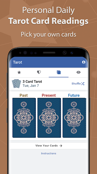 และอย่าลืมการ์ดไพ่ทาโรต์ประจำวันของคุณ ในแต่ละวันคุณจะสามารถเข้าถึงการอ่านไพ่ทาโรต์สามใบใหม่ รับดาดฟ้าสับแล้วเลือกไพ่สามใบของคุณเองหนึ่งใบสำหรับอดีตปัจจุบันและอนาคต