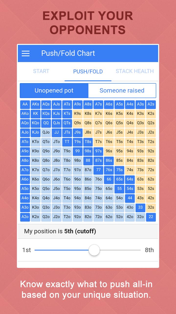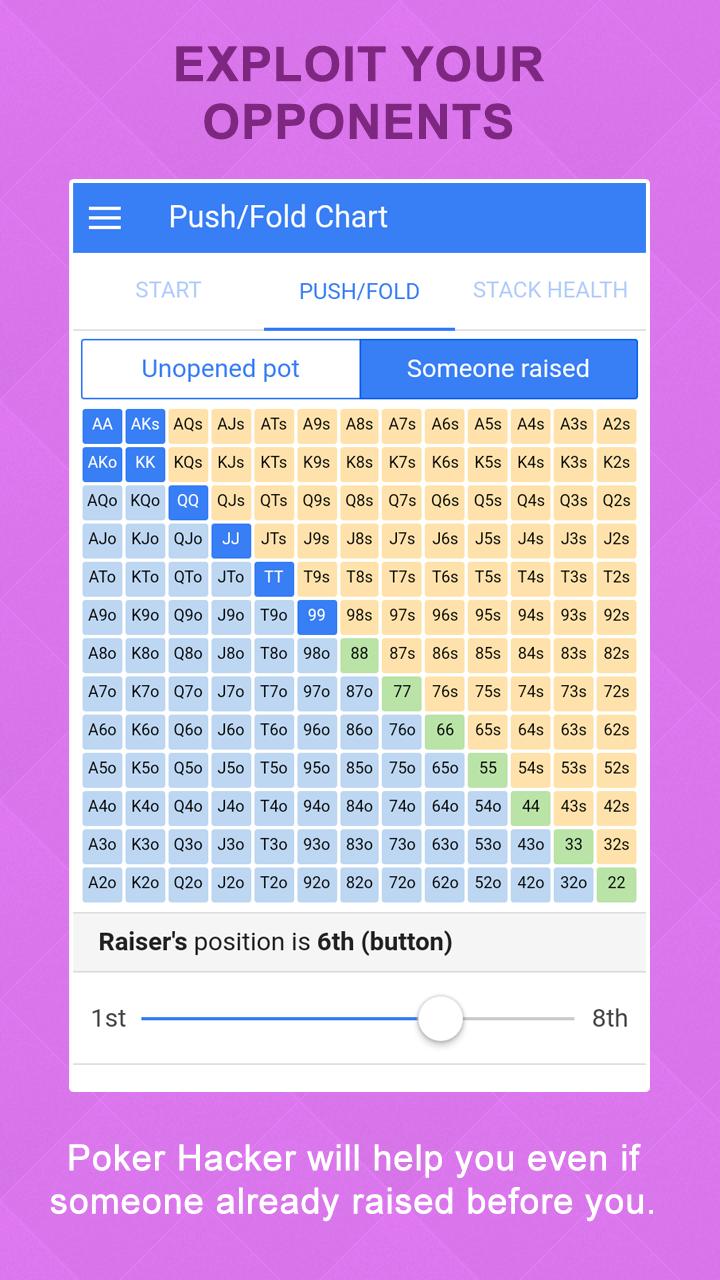 แอพนี้ทำงานได้ดีที่สุดสำหรับการแข่งขันโป๊กเกอร์ Holdem Poker เมื่อมีผู้เล่น 7-10 คนที่โต๊ะของคุณและผ้าม่านเริ่มสูงเมื่อเทียบกับขนาดสแต็กของคุณ (คุณเป็นสแต็กสั้น ๆ ) หากคุณมีซ้อนกันลึก (ผ้าม่านขนาดใหญ่ 40+) จะเป็นการดีกว่าที่จะเล่นโป๊กเกอร์ "ปกติ" อย่างไรก็ตามเมื่อคุณได้รับซ้อนสั้น ๆ จะไม่มีวิธีที่ดีไปกว่าการเล่นแบบ push-fold ด้วยการใช้ Poker Hacker