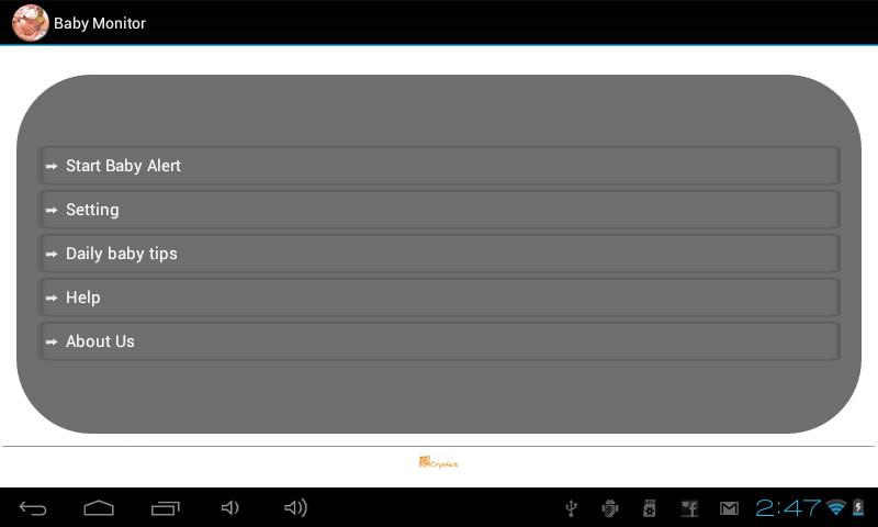 将您的Android手机转换为婴儿显示器。对于此应用程序,您需要两个手机,一个必须是Android,而另一个可以是任何类型。此应用可以帮助您监控宝宝,而在其他地方则忙碌。婴儿一开始哭泣,应用就会感觉到声音,并立即调用指定的号码。您需要做的就是启动此应用程序,并设置您的设置,例如移动设备,声音级别等,并将移动设置保持在婴儿附近。