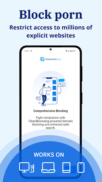 Covenant Eyes应用程序还通过色情阻塞,强迫SafeSearch和可自定义的域块为您提供可选的保护,并允许列表避免触发网站和内容。为了获得最佳效果,请在您使用的所有设备上安装Covenant Eyes应用程序。
