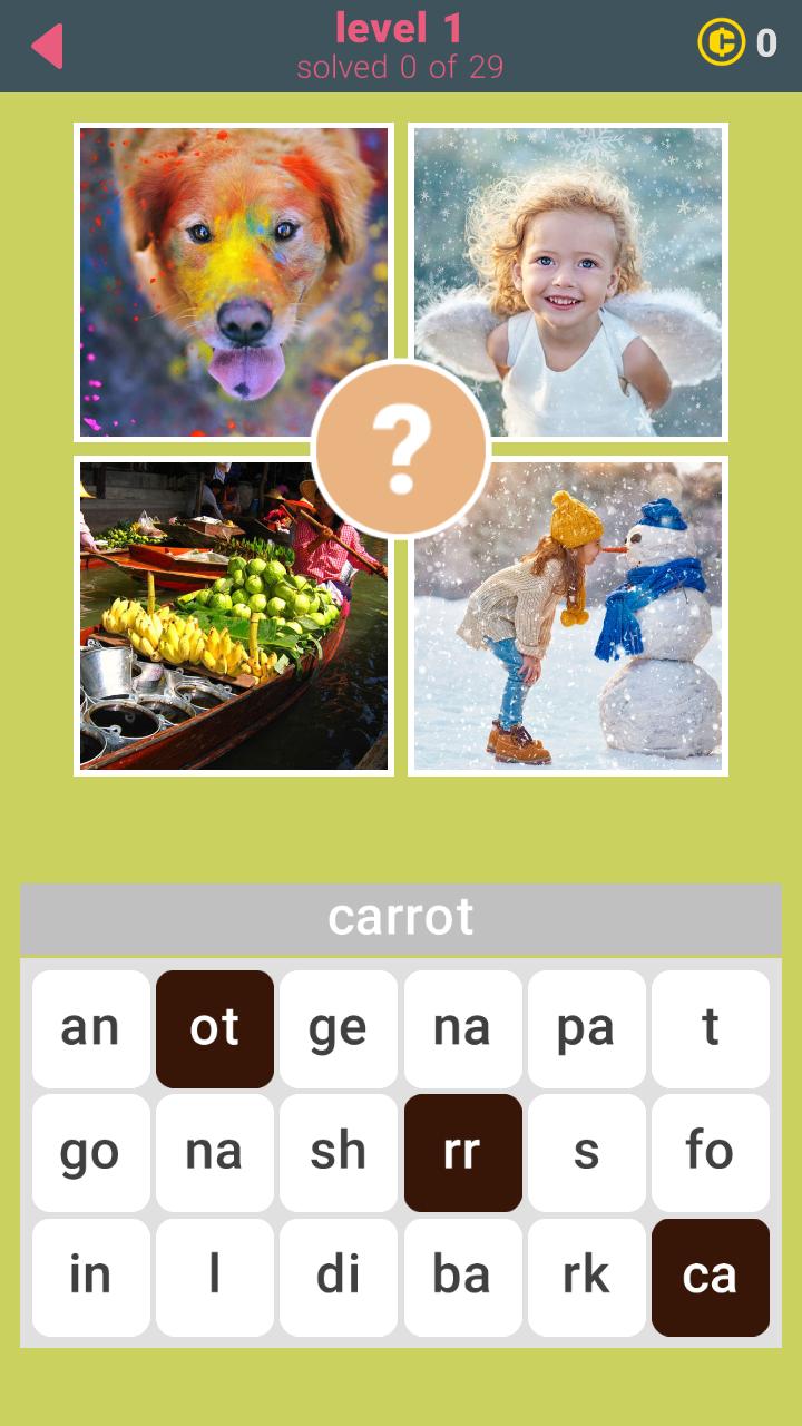 每张照片一个单词。每个级别29个字。游戏中的638 Words 。你能找到所有的吗?有时,您必须超越明显的思考。祝你好运!