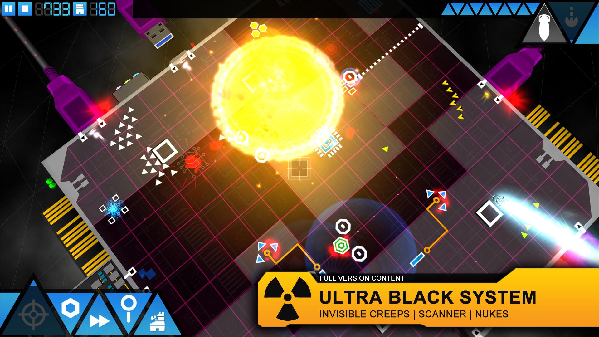 有21座防御塔,从手枪坐在马车上到达,焚化了火焰驱逐器到强大的远程轨道塔塔。另外,有7个生产塔产生您的主要资源:RAM(随机访问存储器)。是的,建立小型RAM经济非常重要,以保持系统例程运行。塔必须由昂贵的胶囊部署,您必须找到适量的资源生产塔与防御范围的性能之间的最佳位置。您可以在Uplab中解锁并安装新的塔式版本。