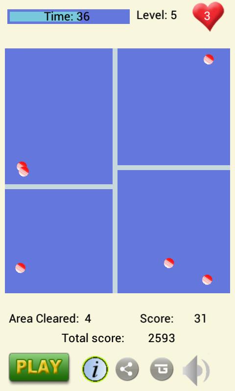 JezzBall is a fun, strategy ball confining multi level game, player's goal is to build the wall to confine the ball in minimum area and clear the rest of the area in given time.如果球员清除了75%的面积,他将获胜并越过水平。如果玩家无法清除75%的面积,他必须提高到上一个水平。在获胜时给出了分数点,在失败时,得分点会降低。