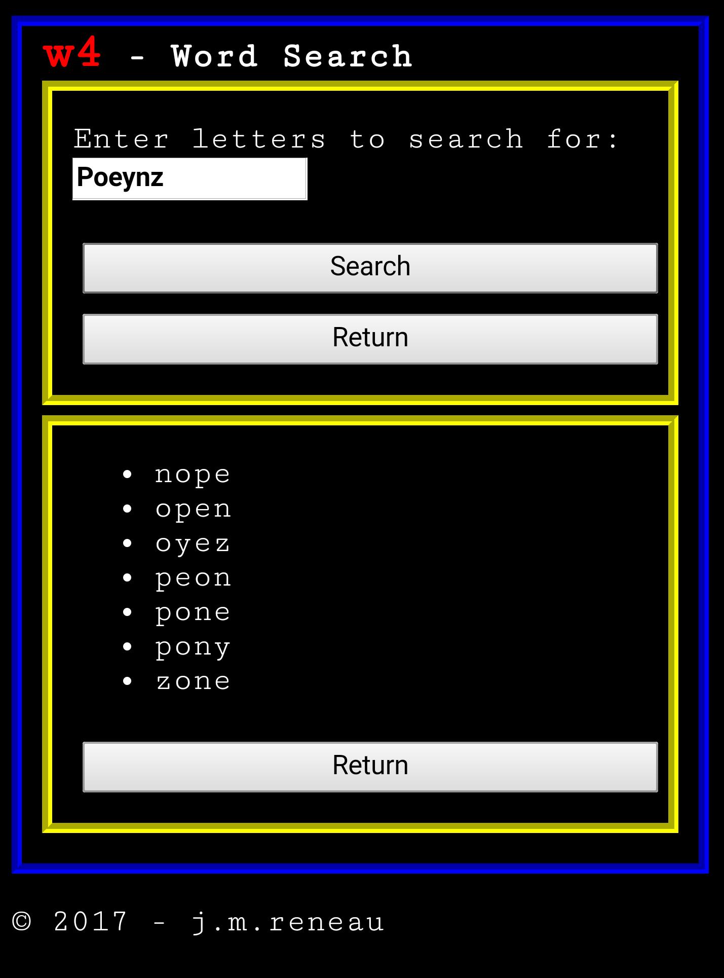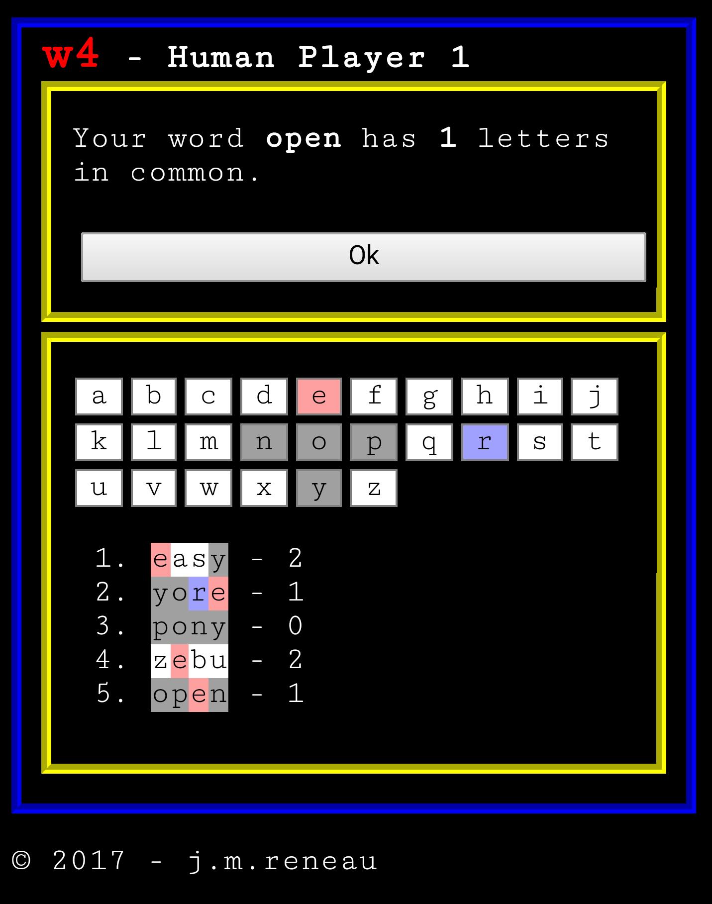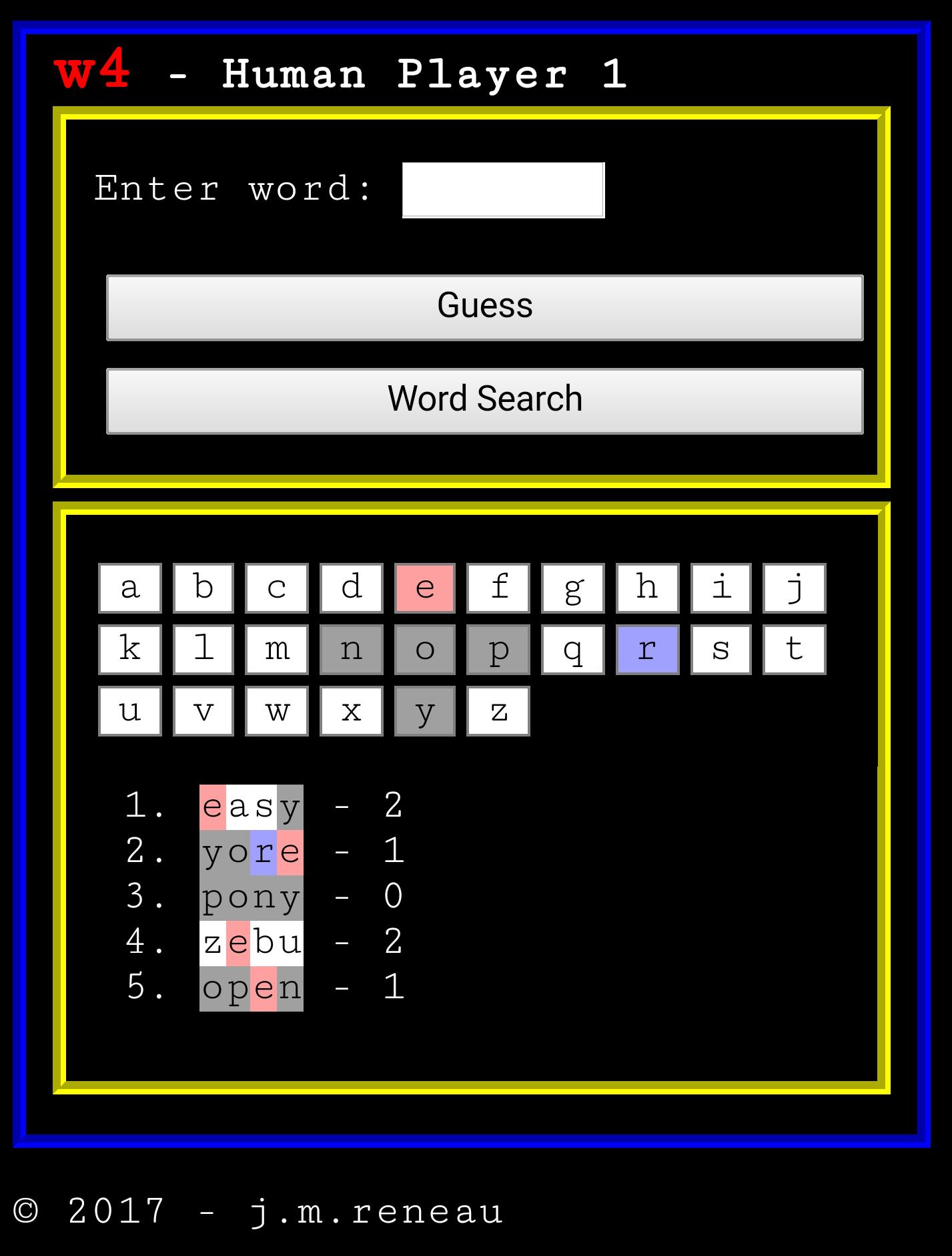 W4是一个单词猜测游戏,每个玩家都有一个秘密的4个字母单词,而对象首先要猜测他们的单词。