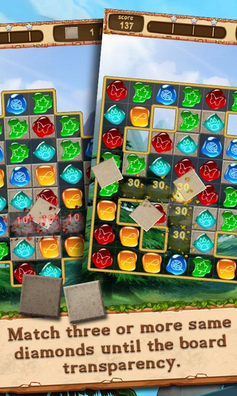 - 匹配三個或更多相同的鑽石,直到板透明性。