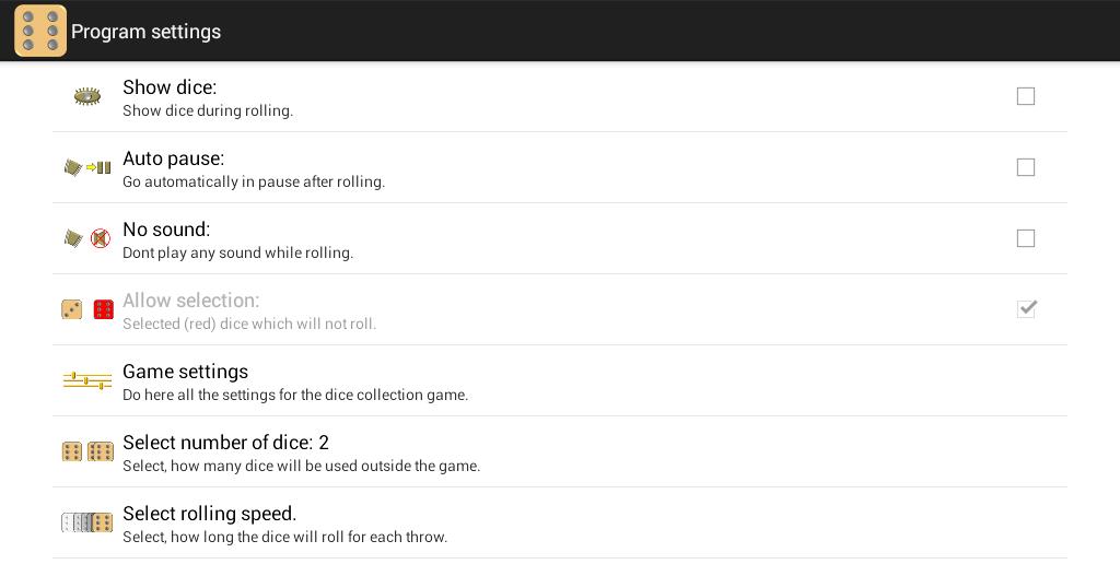 使用此程序,您只需擲骰子,以隱藏的模式滾動它們,也可以玩收集遊戲。這可以用多達6個滴來完成。該遊戲是完整的可配置的(可以選擇哪個骰子組合,為哪種組合提供了多少點以及允許每輪擲多少次)。該遊戲最多可使用6個玩家(在一台設備上)進行 - 但是在這裡建議使用平板電腦 - 在手機上,遊戲通常以單個模式進行。重置按鈕允許您將設置放在默認值